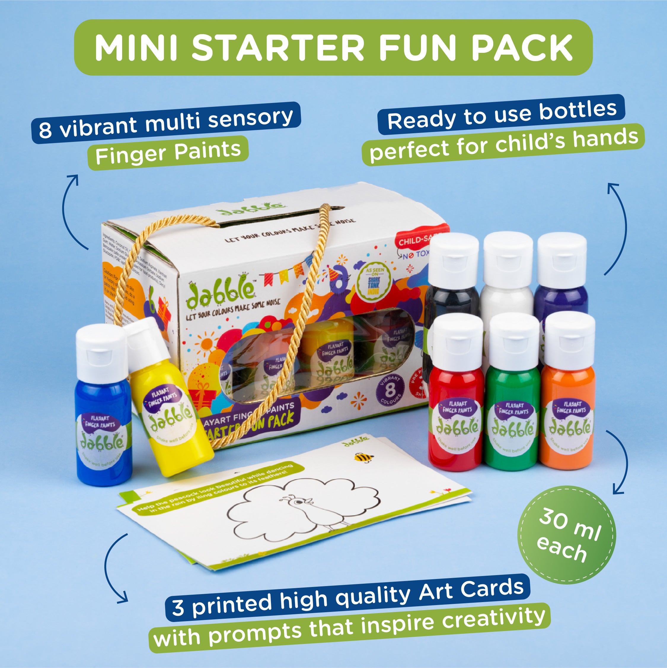 💖8 Non-Toxic playart Finger Paints with 8 different Vibrant Colours (Red, Blue, Yellow, Black, White, Orange, Green & Purple) in 30 ml bottles.
