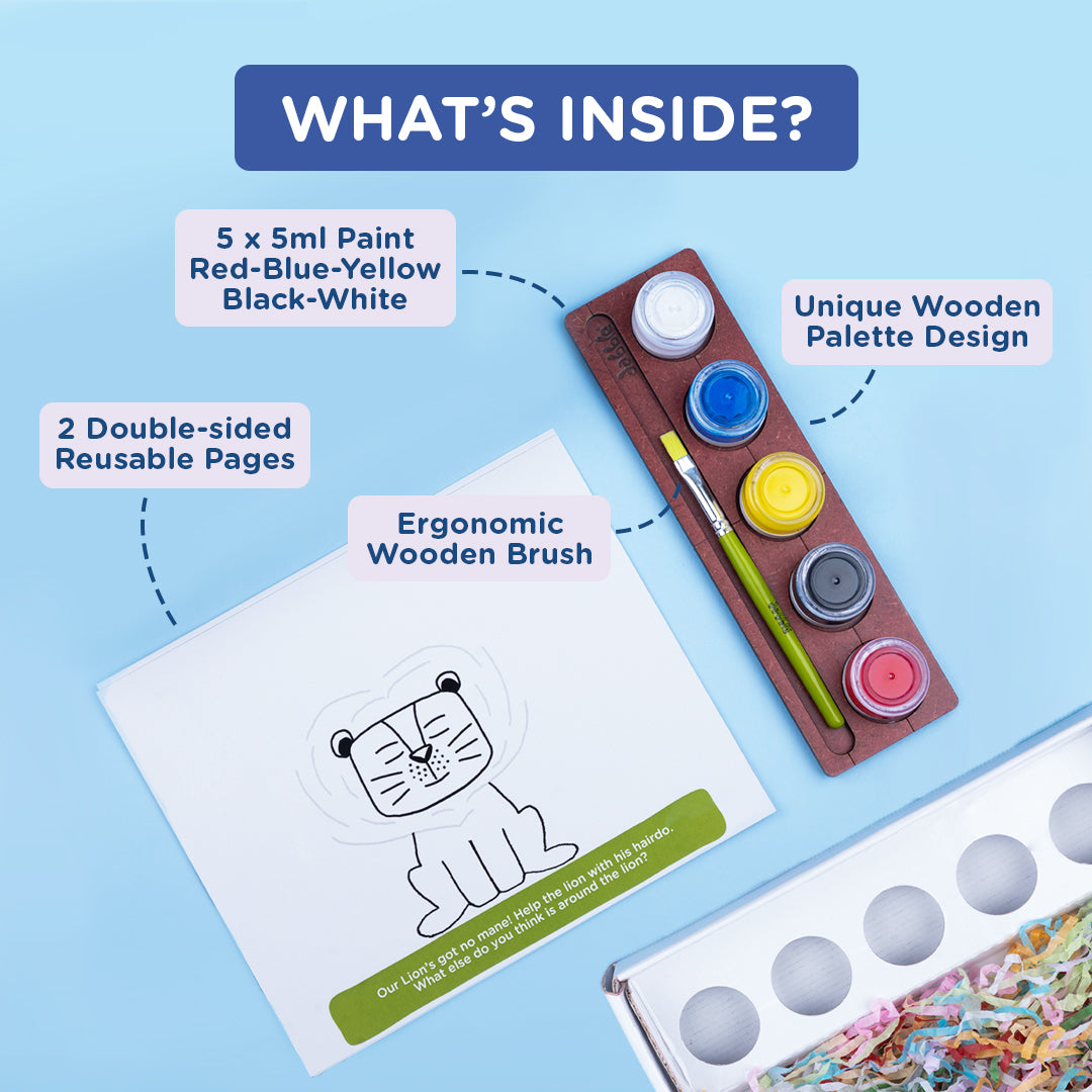You will receive 2 Double-Sided Reusable Cards, 1 Wooden Palette, 1 Wooden Brush (12 cm length), and 5 Vibrant Paints In 5ml Acrylic Bottles.