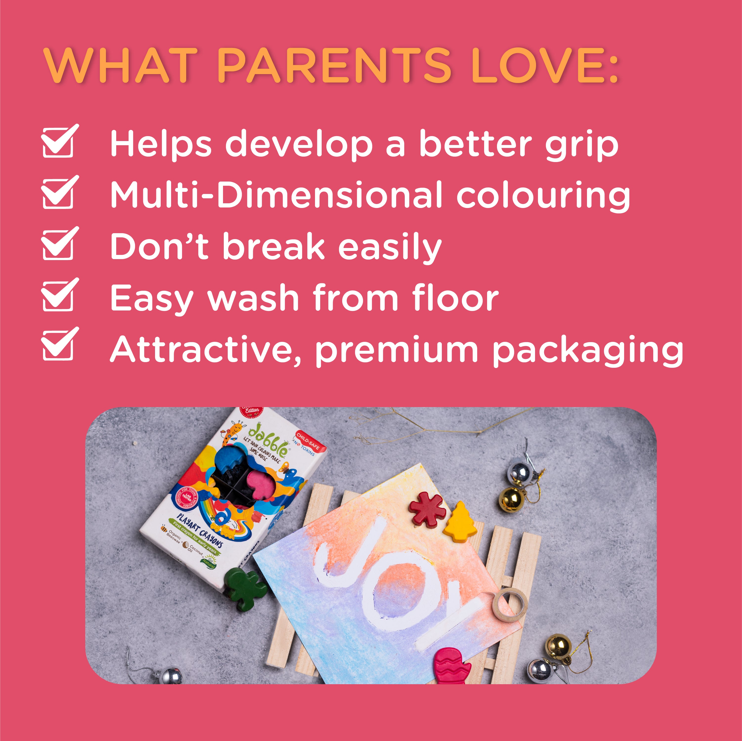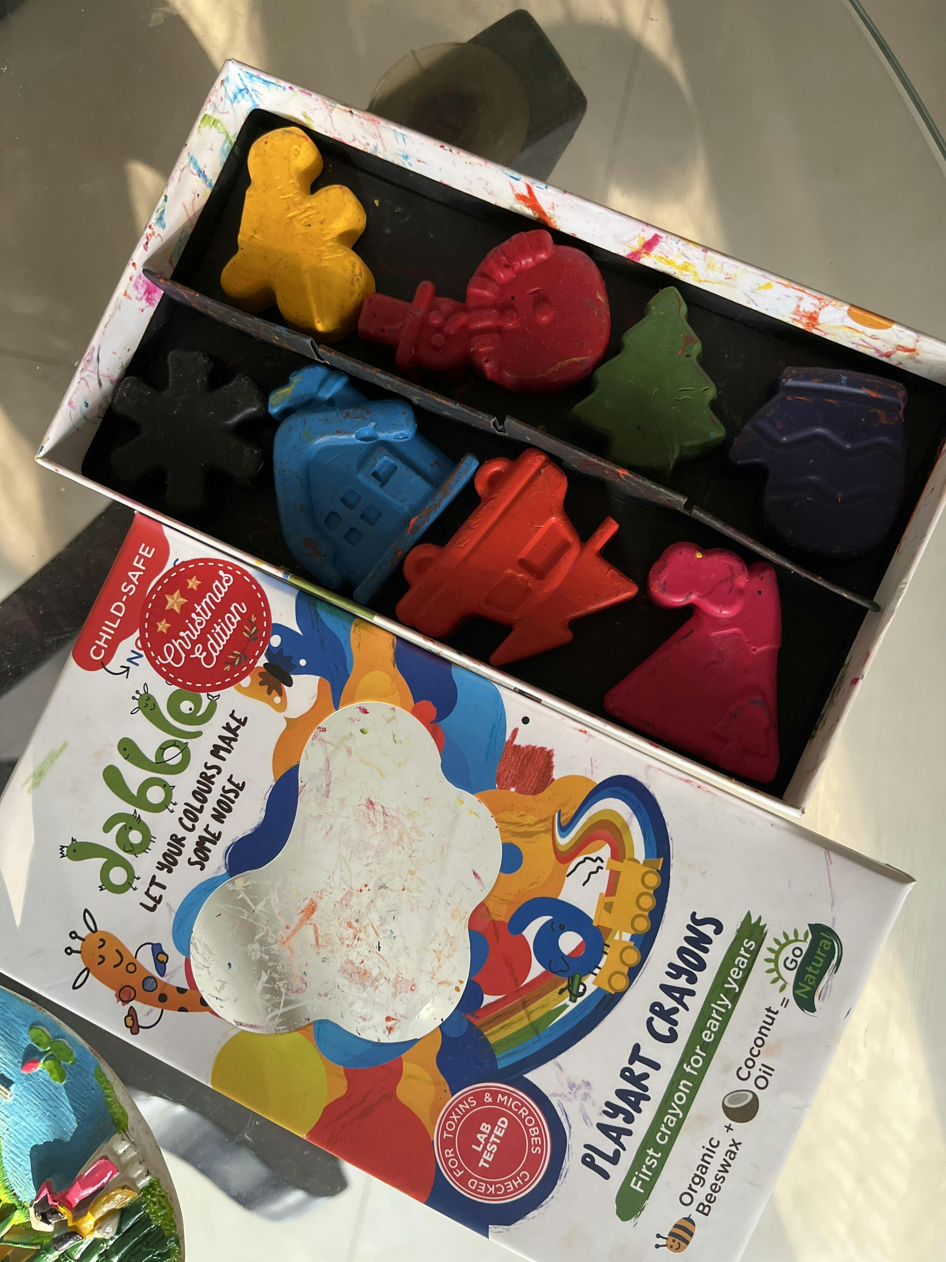 Dabble Christmas Crayons are a box of Bees wax Crayons that not only colour beautifully, but also bring out imagination, creativity and free expression. They have been specially formulated for young kids using toxin free and child-safe ingredients that have been certified in a NABL lab. The crayons create magical stories in the little kids’ hands. They can also be used for stacking, learning shapes and colours and free play.