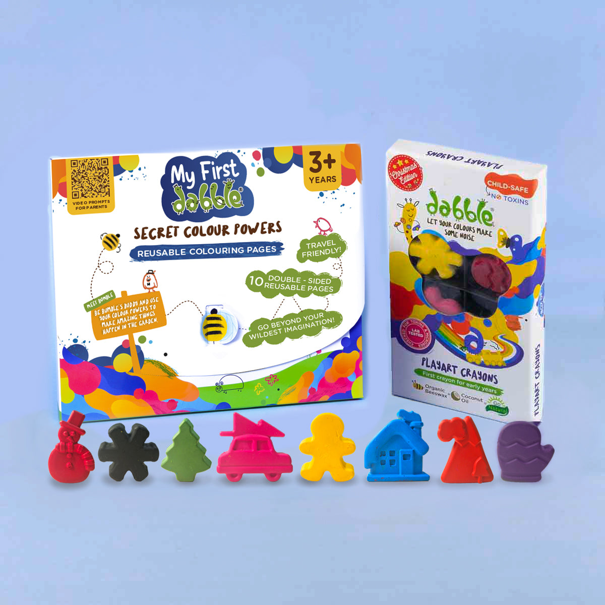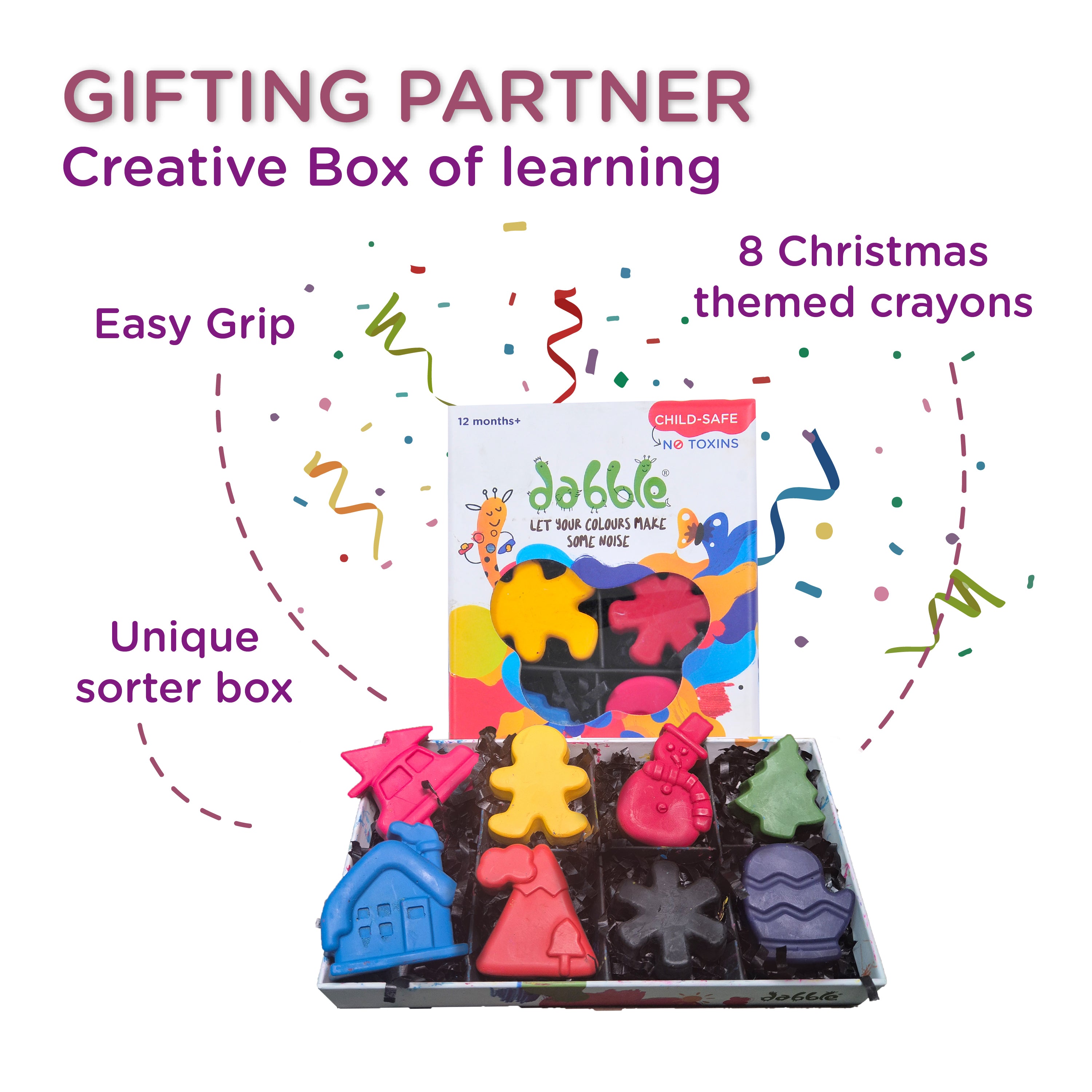 Dabble Christmas Crayons are a box of Bees wax Crayons that not only colour beautifully, but also bring out imagination, creativity and free expression. They have been specially formulated for young kids using toxin free and child-safe ingredients that have been certified in a NABL lab. The crayons create magical stories in the little kids’ hands. They can also be used for stacking, learning shapes and colours and free play.