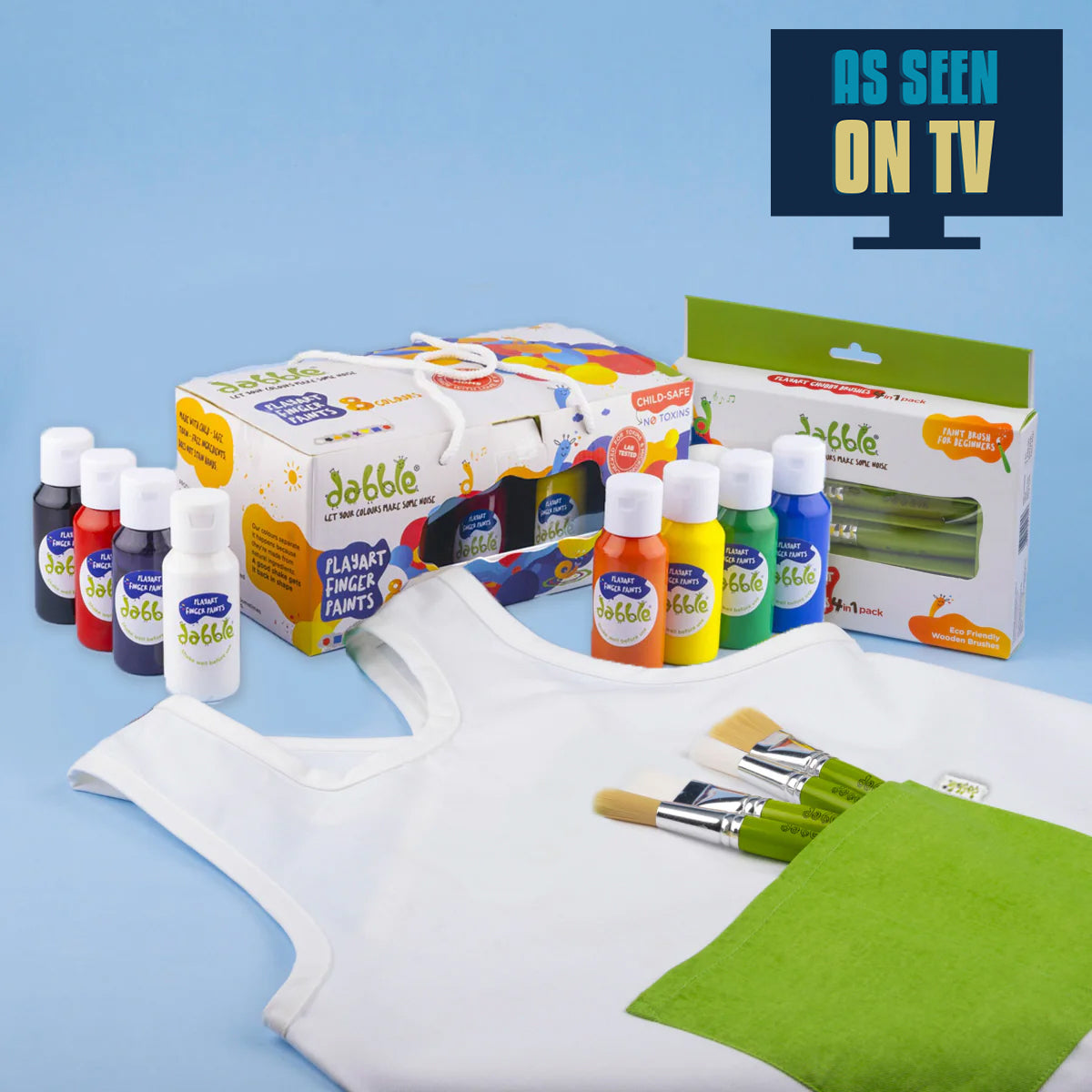 Dabble Finger painting Super pack โ includes our brand new Playart Finger Paints in 8 Colours, Playart Chubby Brushes, and our Dabble Painting Art Apron