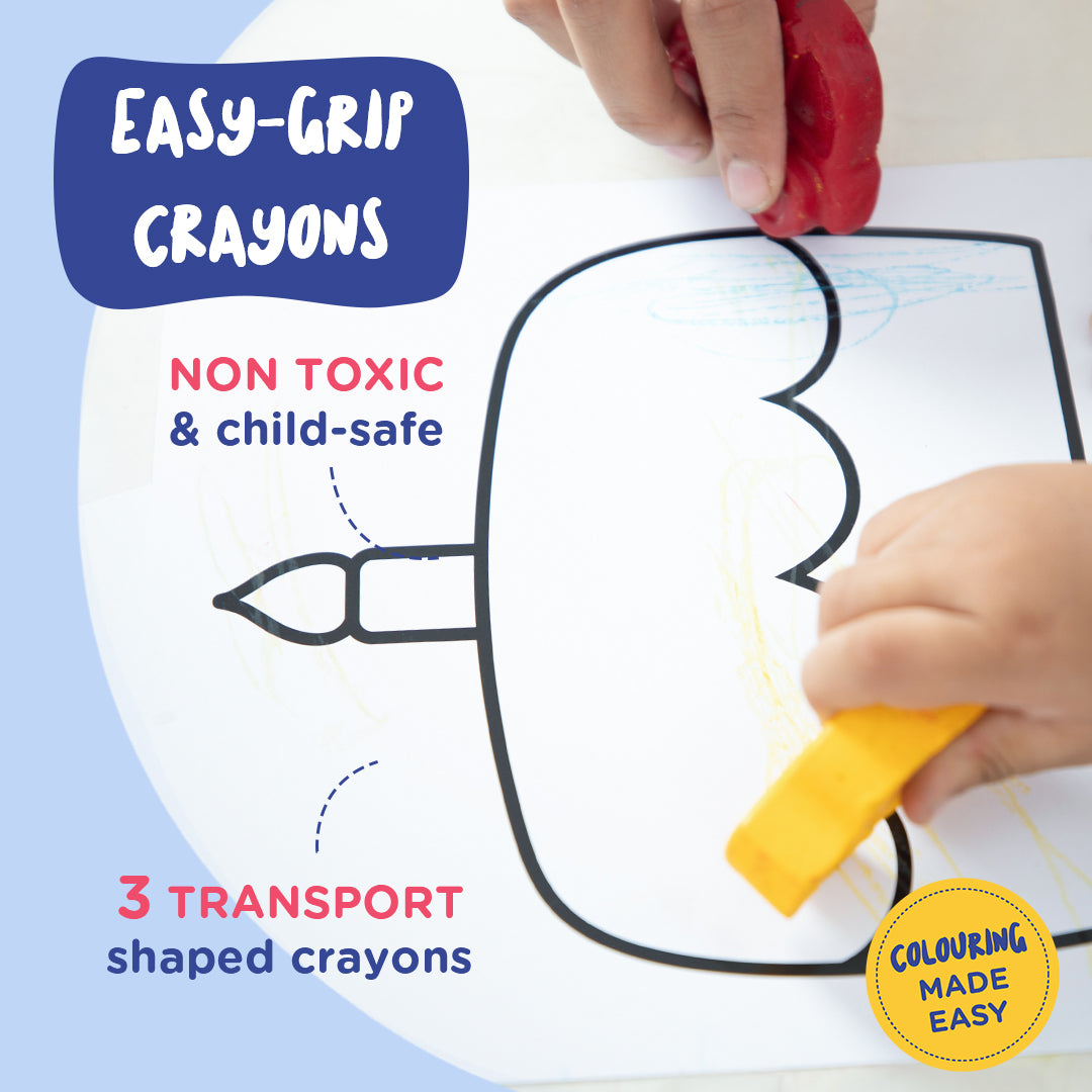 ✅ Non-Toxic, Easy-Grip Crayons: Includes 3 easy-to-grasp, transport-shaped non-toxic crayons made from organic beeswax for safe, effortless colouring.