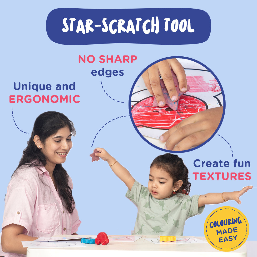 ✅ Unique Ergonomic Star Scratch Tool: Comes with a specially designed star-shaped wooden scratch tool with no sharp edges, allowing children to create fun textures as they colour, adding a new layer of creativity.