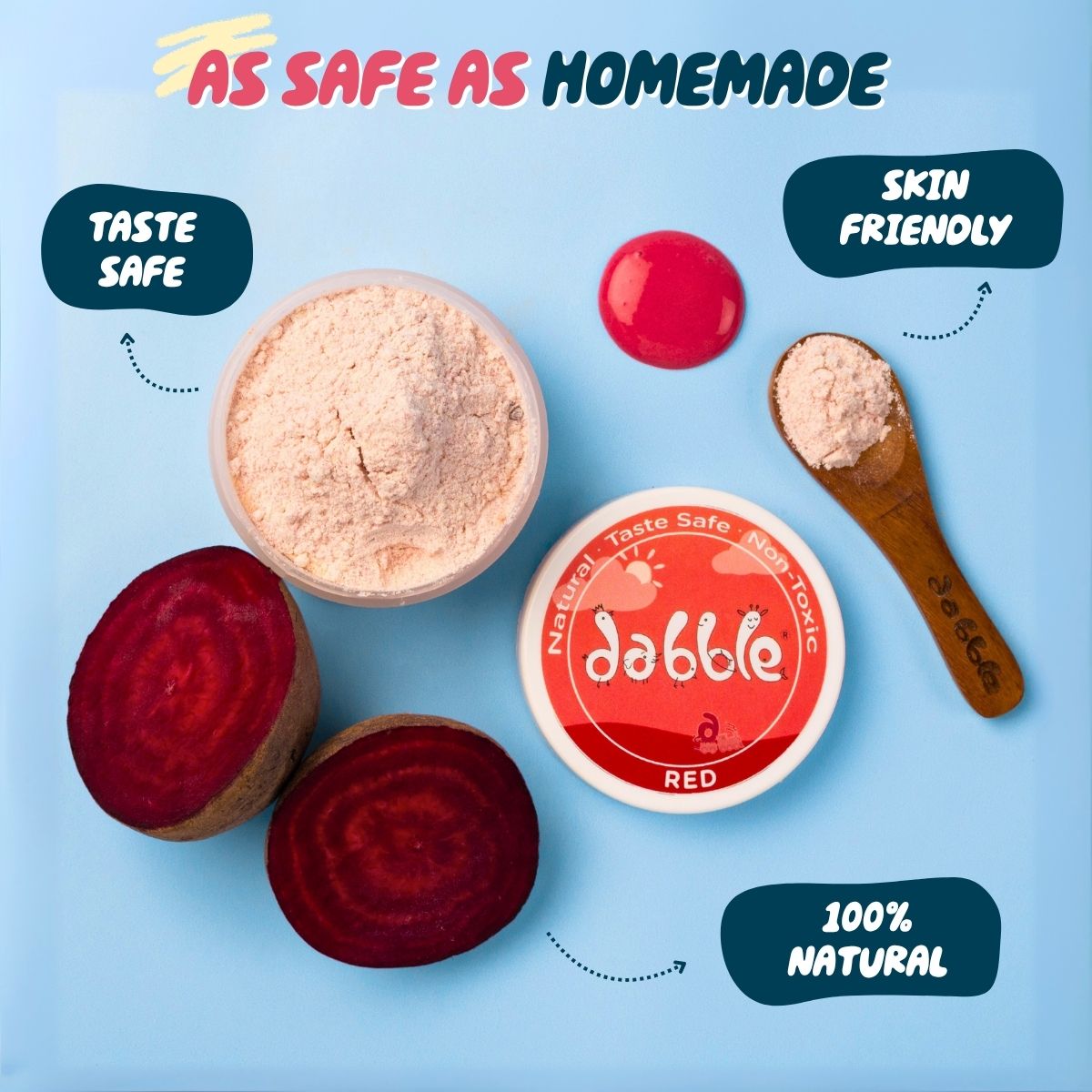 Made with food-safe, plant-based ingredients like corn flour and natural food colours, Magic Paint Dust is perfectly safe even if licked.
