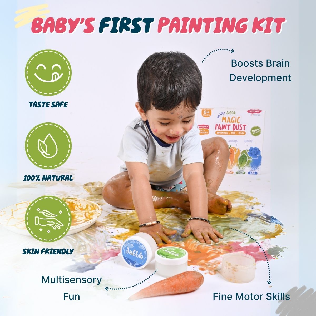 You can begin as early as 6 months. Magic Paint Dust is specially formulated for babies and toddlers in their mouthing and sensory exploration phase — making it a safe and joyful first painting experience.