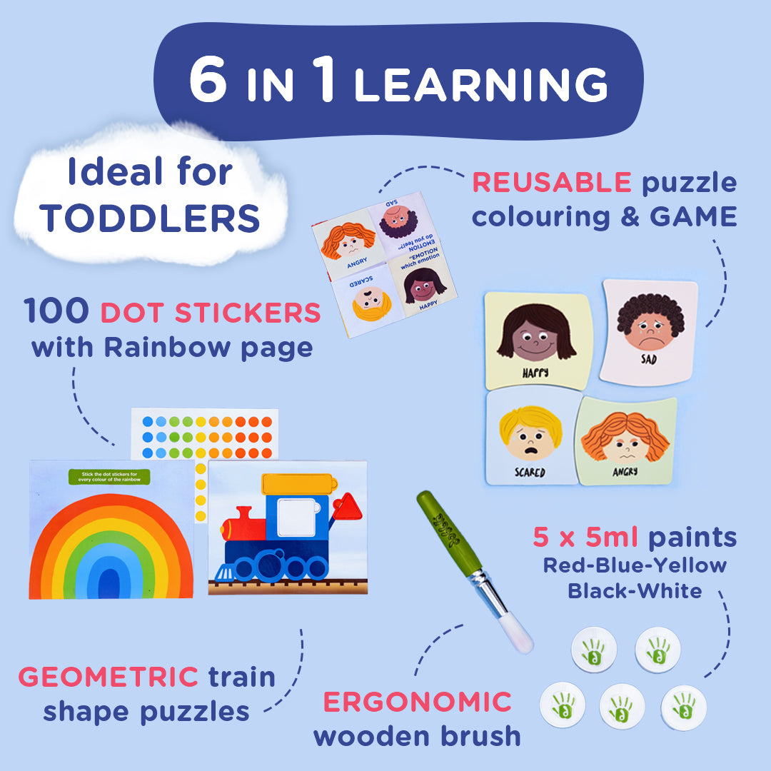Introduce your child to a fun, hands-on way to explore the world of emotions, shapes, and colours with the My First Dabble Puzzle Colouring Set! A 6-in-1 Learning activity set designed for toddlers aged 2+, this kit promotes early learning with engaging, sensory activities that support brain development and motor skills. This child-safe, toxin-free, and reusable puzzle colouring set makes an excellent learning gift that toddlers can enjoy again and again.
