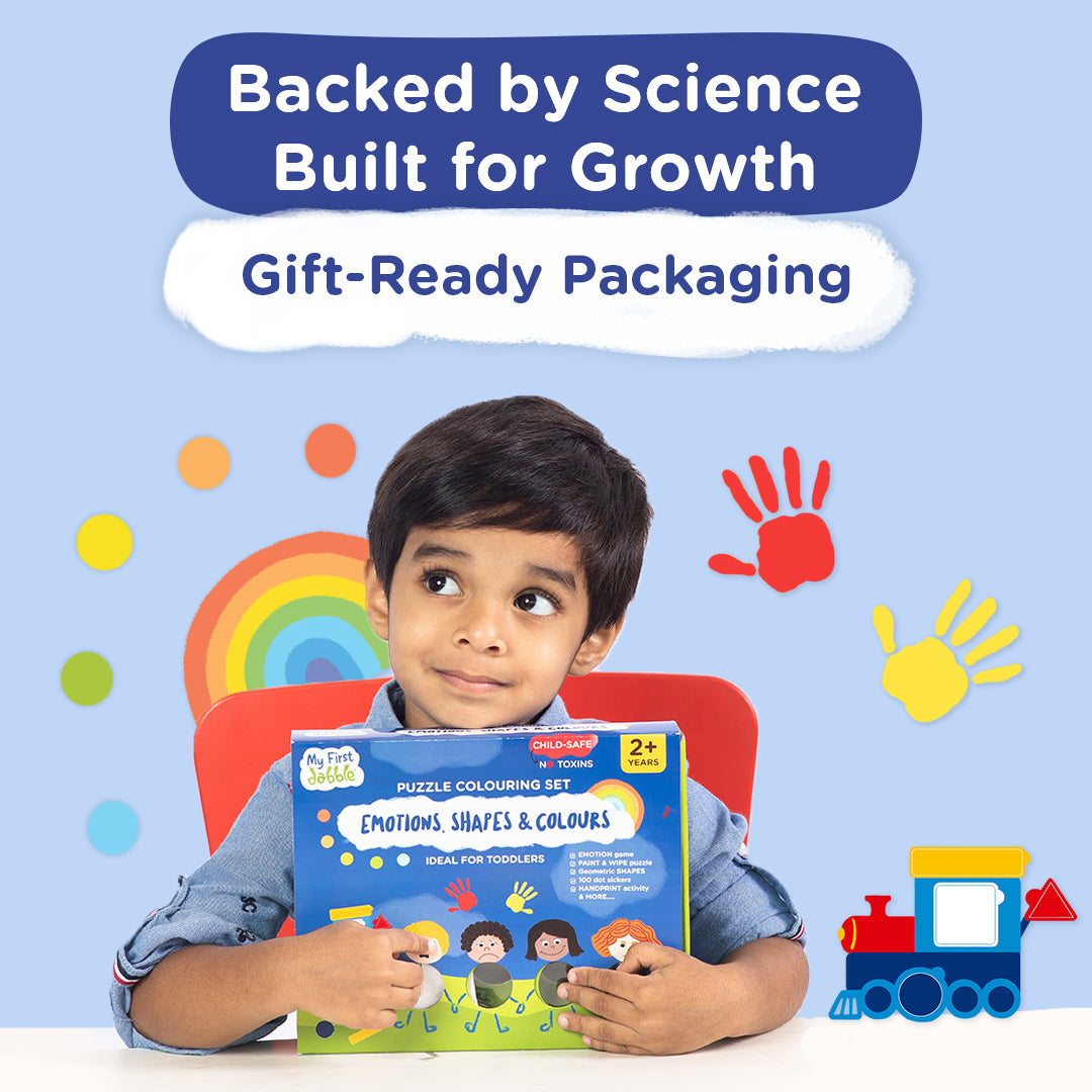 ✅ Emotion Puzzle – Combines emotions, shapes, and colours in an innovative hands-on experience, letting kids explore while they colour, solve, and play! Every piece showcases a unique face with an emotion, designed to help children 2+ years identify, mimic, and discuss emotions.