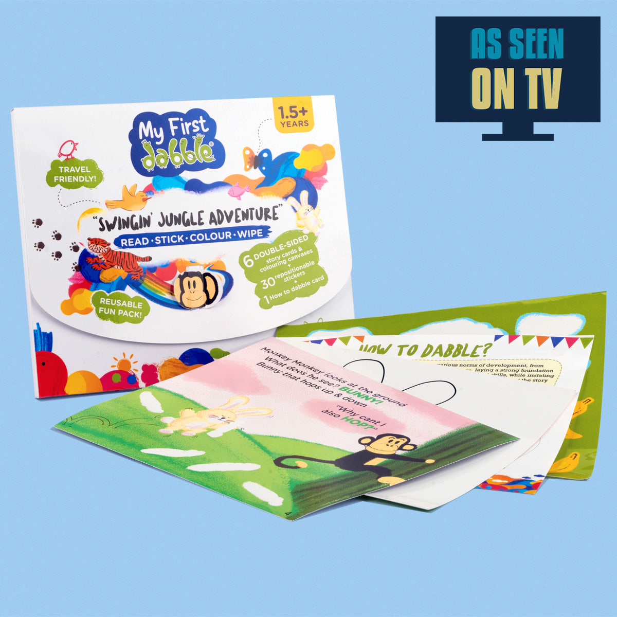 📖 No rules for kids! My first dabble Swingin’ Jungle Adventure includes Double-Sided Story Cards to Read & Colour, Fun Prompts for Parents with Wipeable Sheets to reuse & set the imagination free.
