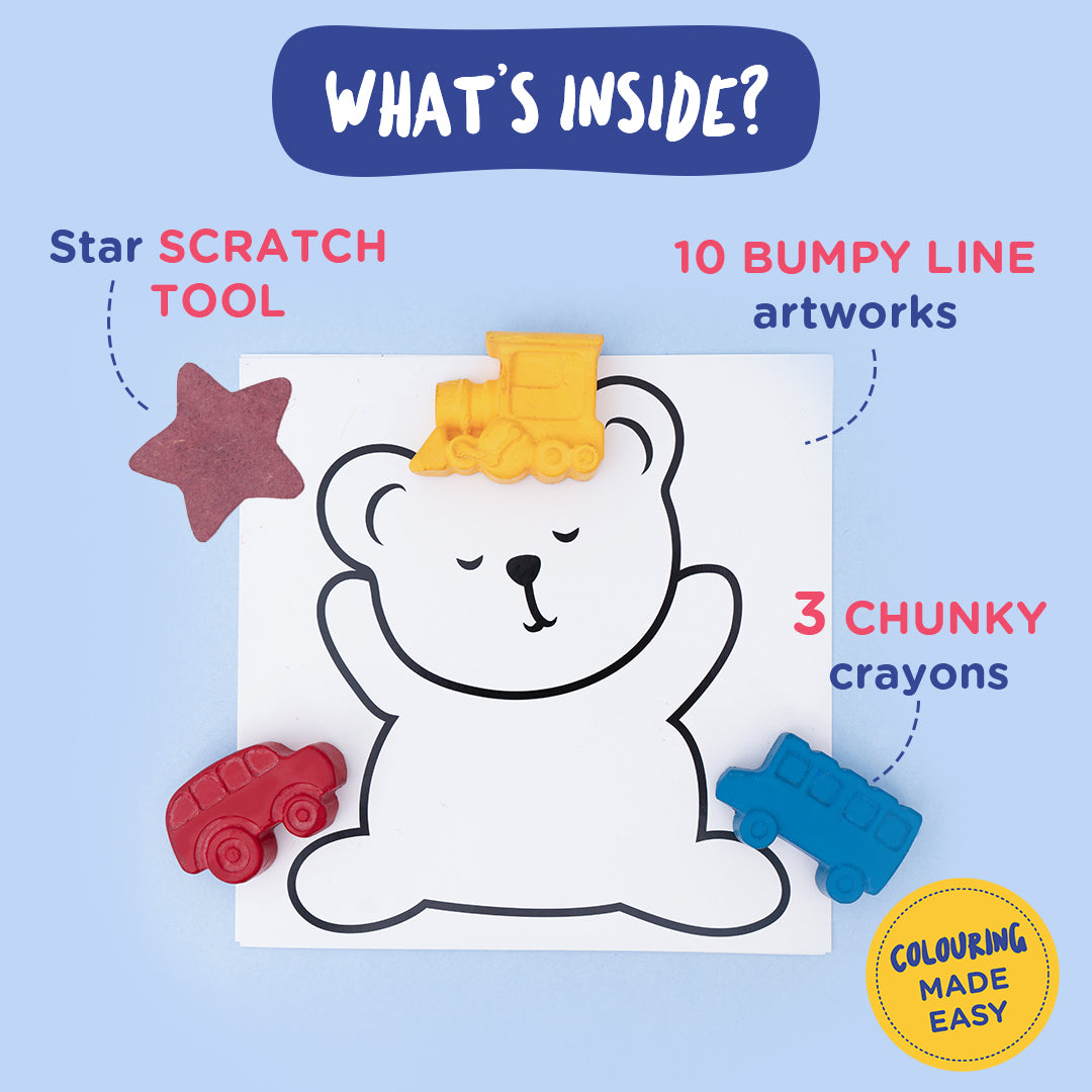 ✅ Non-Toxic, Easy-Grip Crayons: Includes 3 easy-to-grasp, transport-shaped non-toxic crayons made from organic beeswax for safe, effortless colouring.